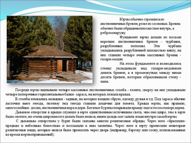 С появлением в Прибайкалье русских появилась деревянная юрта по типу русских изб.