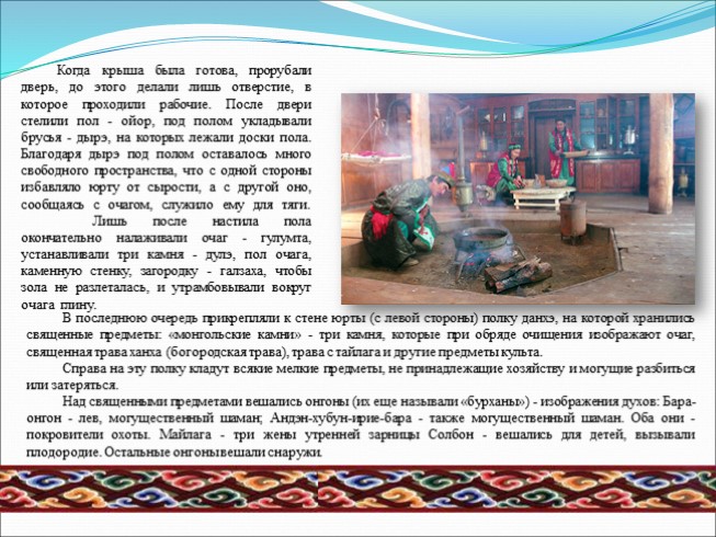В последнюю очередь прикрепляли к стене юрты (с левой стороны) полку данхэ, на которой хранились священные предметы: «монгольские камни» - три камня, которые при обряде очищения изображают очаг, священная трава ханха (богородская трава), трава с тайлага и другие предметы культа.