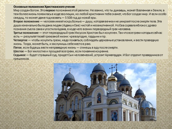 Основные положения Христианского учения Мир создан Богом. Это первое положение этой религии. Не важно, что ты думаешь, может Вселенная и Земля, а тем более жизнь появилась в ходе эволюции, но любой христианин тебе скажет, что Бог создал мир. И если особо сведущ, то может даже год назвать — 5 508 год до новой эры. Второе положение — человек имеет искру Божью — душу, которая вечна и не умирает после смерти тела. Эта душа изначально была дана людям (Адаму и Еве) чистой и незамутненной. Но Ева сорвала яблоко с древо познания съела сама и угостила Адама, в ходе чего возник первородный грех человека. Третье положение — этот первородный грех Иисусом Христом был искуплен. Так что все грехи которые сейчас есть — результат твоей греховной жизни: чревоугодия, гордыни и пр. Четвертое — чтобы искупить грехи, надо покаяться, соблюдать церковные установления, и вести праведную жизнь. Тогда, может быть, и заслужишь себе место в раю. Пятое, если будешь вести неправедную жизнь — сгинешь в аду после смерти. Шестое — Бог милостив и прощает все грехи, если покаяние искренне. Седьмое — будет страшный суд, придет Сын человеческий, устроит Армагеддон. И Бог отделит праведников от грешников.