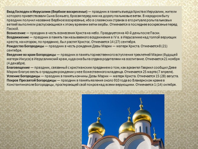 Вход Господен в Иерусалим (Вербное воскресенье) — праздник в память въезда Христа в Иерусалим, жители которого приветствовали Сына Божьего, бросая перед ним на дорогу пальмовые ветви. В народном быту праздник получил название Вербное воскресенье, ибо в славянских странах в его ритуале роль пальмовых ветвей выполняли распускающиеся к этому времени ветки вербы. Отмечается в последнее воскресенье перед Пасхой. Вознесение — праздник в честь вознесения Христа на небо. Празднуется на 40-й день после Пасхи. Воздвижение — праздник в память так называемого воздвижения в IV в. в Иерусалиме над толпой верующих креста, на котором, по преданию, был распят Христос. Отмечается 14 (27) сентября. Рождество Богородицы — праздник в честь рождения Девы Марии — матери Христа. Отмечается 8 (21) сентября. Введение во храм Богородицы — праздник в память торжественного вступления трехлетней Марии (будущей матери Иисуса) в Иерусалимский храм, куда она была отдана родителями на воспитание. Отмечается 21 ноября (4 декабря). Благовещение — праздник, связанный с христианским преданием о том, как архангел Гавриил сообщил Деве Марии благую весть о грядущем рождении у нее божественного младенца. Отмечается 25 марта (7 апреля). Успение Богородицы — праздник в память кончины Девы Марии — матери Христа. Отмечается 15 (28) августа. Покров Пресвятой Богородицы — праздник в память явления около 910 года во Влахернском храме в Константинополе Богородицы, простирающей свой покров над всеми верующими. Отмечается 1 (14) октября.