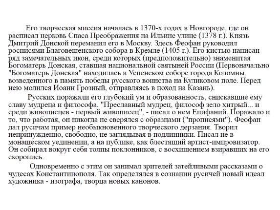 Зрелым, сложившимся мастером Феофан Грек приехал на Русь. Благодаря ему русские живописцы получили возможность познакомиться с византийским искусством в исполнении не рядового мастера-ремесленника, а гения.