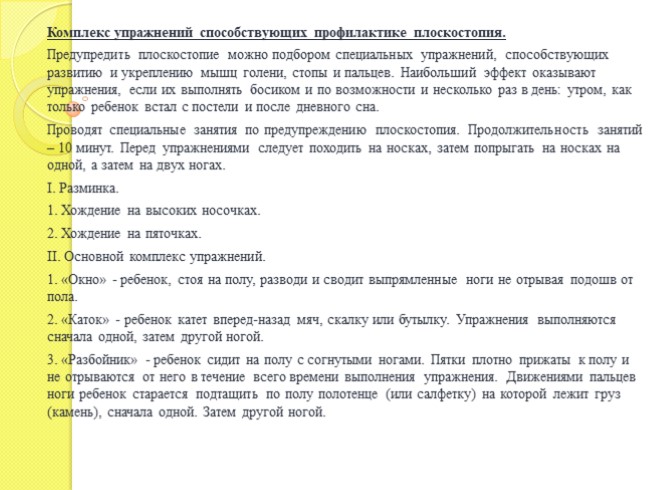 Профилактика плоскостопия включает в себя: комплексы упражнений, ношение правильно подобранной обуви и ортопедических стелек.