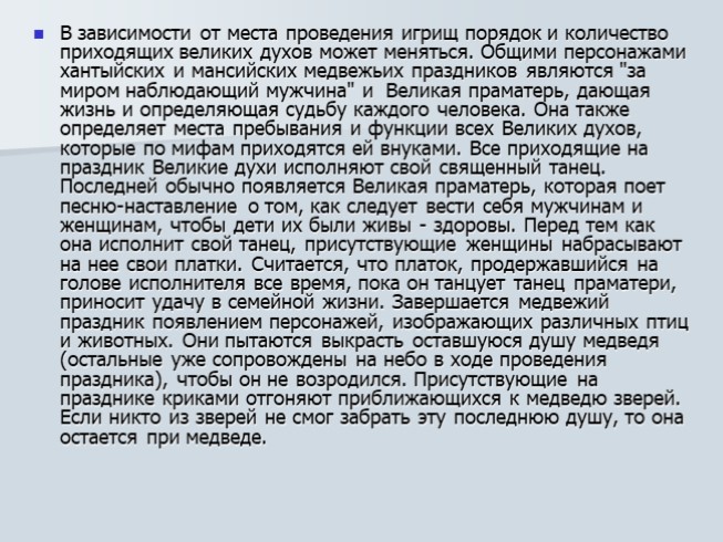 Медвежий праздник или медвежьи игрища - наиболее древняя церемония, которая сохранилась и до наших дней. Этот праздник занимает центральное место в культуре ханты- мансийский народностей. Различные формы почитания медведя прослеживаются в археологических памятниках разных эпох и известны у многих народов мира. В Северной Азии культ медведя и медвежий праздник наиболее развиты у обских угров (хантов и манси), народов Нижнего Амура, кетов, эвенков, в Северной Америке у атапасков, в Японии - у айнов. Медвежьи игрища проводились как периодически (один раз в семь лет).Различные авторы по-разному объясняют возникновение культа медведя . Большинство исследователей видят смысл медвежьих церемоний в стремлении помирить душу медведя с добывшим его охотником. В то же время в культе медведя четко выражается отношение к нему как промысловому животному, возрождение которого на земле является очень важным для северных народов.