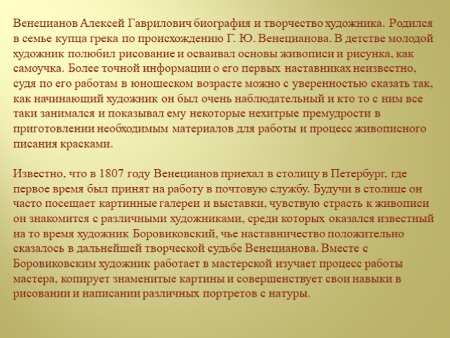 Венецианов Алексей Гаврилович биография и творчество художника. Родился в семье купца грека по происхождению Г. Ю. Венецианова. В детстве молодой художник полюбил рисование и осваивал основы живописи и рисунка, как самоучка. Более точной информации о его первых наставниках неизвестно, судя по его работам в юношеском возрасте можно с уверенностью сказать так, как начинающий художник он был очень наблюдательный и кто то с ним все таки занимался и показывал ему некоторые нехитрые премудрости в приготовлении необходимым материалов для работы и процесс живописного писания красками.