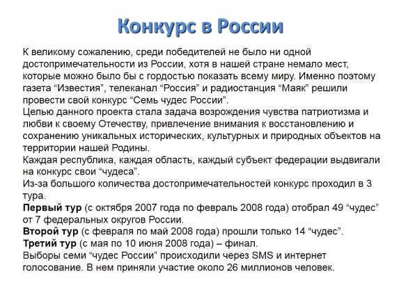К великому сожалению, среди победителей не было ни одной достопримечательности из России, хотя в нашей стране немало мест, которые можно было бы с гордостью показать всему миру. Именно поэтому газета “Известия”, телеканал “Россия” и радиостанция “Маяк” решили провести свой конкурс “Семь чудес России”.
