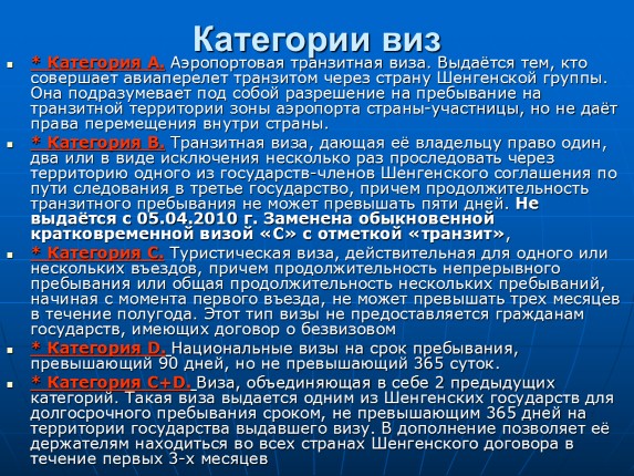 * Категория A. Аэропортовая транзитная виза. Выдаётся тем, кто совершает авиаперелет транзитом через страну Шенгенской группы. Она подразумевает под собой разрешение на пребывание на транзитной территории зоны аэропорта страны-участницы, но не даёт права перемещения внутри страны.