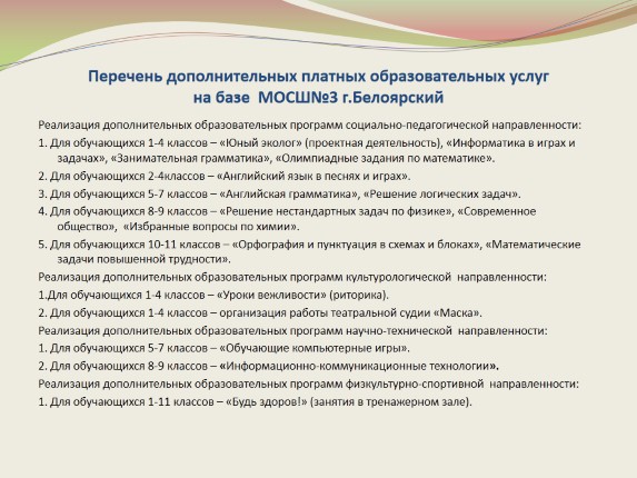 Перечень дополнительных платных образовательных услуг на базе МОСШ№3 г.Белоярский