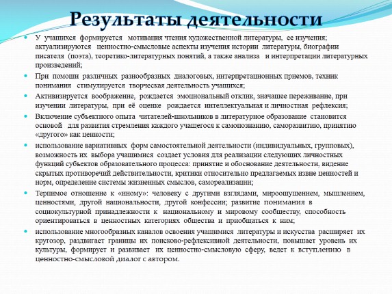 У учащихся формируется мотивация чтения художественной литературы, ее изучения; актуализируются ценностно-смысловые аспекты изучения истории литературы, биографии писателя (поэта), теоретико-литературных понятий, а также анализа и интерпретации литературных произведений;