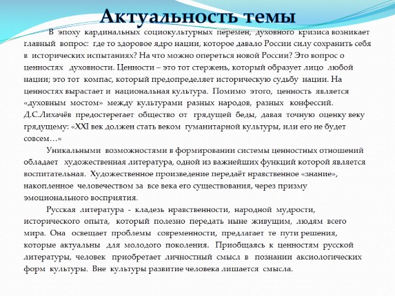 которые актуальны для молодого поколения. Приобщаясь к ценностям русской