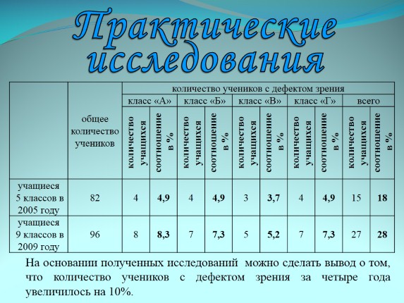 На основании полученных исследований можно сделать вывод о том, что количество учеников с дефектом зрения за четыре года увеличилось на 10%.