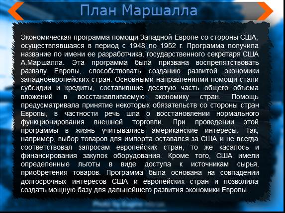Экономическая программа помощи Западной Европе со стороны США, осуществлявшаяся в период с 1948 по 1952 г. Программа получила название по имени ее разработчика, государственного секретаря США А.Маршалла. Эта программа была призвана воспрепятствовать развалу Европы, способствовать созданию развитой экономики западноевропейских стран. Основными направлениями помощи стали субсидии и кредиты, составившие десятую часть общего объема вложений в восстанавливаемую экономику стран. Помощь предусматривала принятие некоторых обязательств со стороны стран Европы, в частности речь шла о восстановлении нормального функционирования внешней торговли. При проведении этой программы в жизнь учитывались американские интересы. Так, например, выбор товаров для импорта оставался за США и не всегда соответствовал запросам европейских стран, то же касалось и финансирования закупок оборудования. Кроме того, США имели определенные льготы в виде доступа к источникам сырья, приобретения товаров. Программа была основана на совпадении долгосрочных интересов США и европейских стран и позволила создать мощную базу для дальнейшего развития экономики Европы.