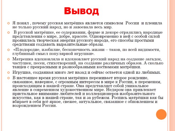 В русской матрёшке, ее содержании, форме и декоре отразились народные представления о мире, добре, красоте. Одновременно в ней с особой силой проявилась творческая энергия русского народа, его способы простыми средствами создавать выразительные образы.
