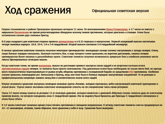 Информация про фланговый удар — не более чем миф. Прохоровское сражение было частью (основной) общего наступления, в которую были включены 5 из 7 армий Воронежского фронта, а именно: 5 гв. ТА, 5 гв. А, 1 ТА, 6 гв. А и 69 А. Наступление абсолютно всех армий планировалось в лоб наступающих немецких войск:
