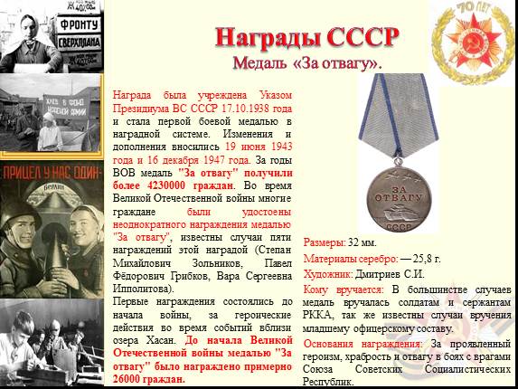 Основания награждения: За мужественные действия во время боя, при защите границ Советского Союза и другие заслуги.