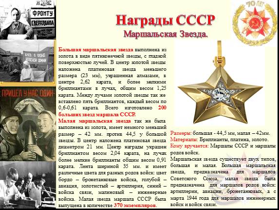 Кому вручается: Маршалы СССР и маршалы родов войск.