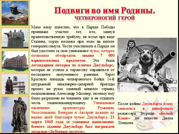 Мало кому известно, что в Параде Победы принимал участие тот, кто, минуя правительственную трибуну, не встал при виде Сталина, гордо возлежа при этом на кителе генералиссимуса. Чести участвовать в Параде он был удостоен за свое уникальное чутье, которое позволило обезвредить свыше 7 000 взрывоопасных предметов. Это была легендарная овчарка по кличке Джульбарс, которая не успела к торжеству оправиться от последнего полученного ранения. Через Красную площадь четвероногого бойца 14-й штурмовой инженерно-саперной бригады пронес на руках главный кинолог страны, подполковник Александр Мазовер, поэтому ему было разрешено не чеканить шаг и не отдавать честь главнокомандующему. Уникальные памятники архитектуры Румынии, Чехословакии, Венгрии и Австрии дожили до наших дней благодаря чутью Джульбарса. 21 марта 1945 года за успешное выполнение боевого задания Джульбарс был награжден медалью «За боевые заслуги».