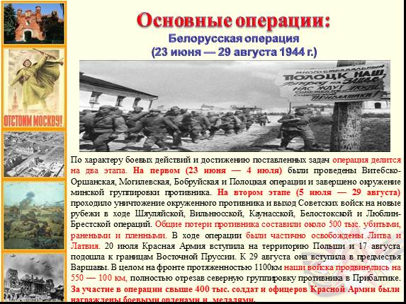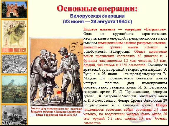 Кодовое название — операция «Багратион». Одна из крупнейших стратегических наступательных операций, предпринятая советским высшим командованием с целью разгрома немецко-фашистской группы армий «Центр» и освобождения Белоруссии. Общее количество войск противника составляло 63 дивизии и 3 бригады численностью 1,2 млн человек, 9,5 тыс. орудий, 900 танков и 1350 самолетов. Командовал вражеской группировкой генерал-фельдмаршал Э. Буш, а с 28 июня — генерал-фельдмаршал В. Модель. Ей противостояли советские войска четырех фронтов (под командованием соответственно генерала армии И. X. Баграмяна, генерала армии И. Д. Черняховского, генерала армии Г. Ф. Захарова и Маршала Советского Союза К. К. Рокоссовского. Четыре фронта объединяли 20 общевойсковых и 2 танковые армии. Общая численность советских войск достигала 2,4 млн человек, на вооружении которых было около 86 тыс. орудий, 5,2 тыс. танков, 5,3 тыс. боевых самолетов.