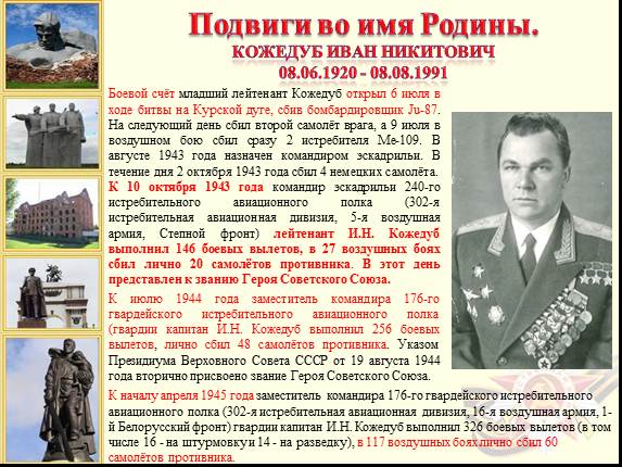 К июлю 1944 года заместитель командира 176-го гвардейского истребительного авиационного полка (гвардии капитан И.Н. Кожедуб выполнил 256 боевых вылетов, лично сбил 48 самолётов противника. Указом Президиума Верховного Совета СССР от 19 августа 1944 года вторично присвоено звание Героя Советского Союза.