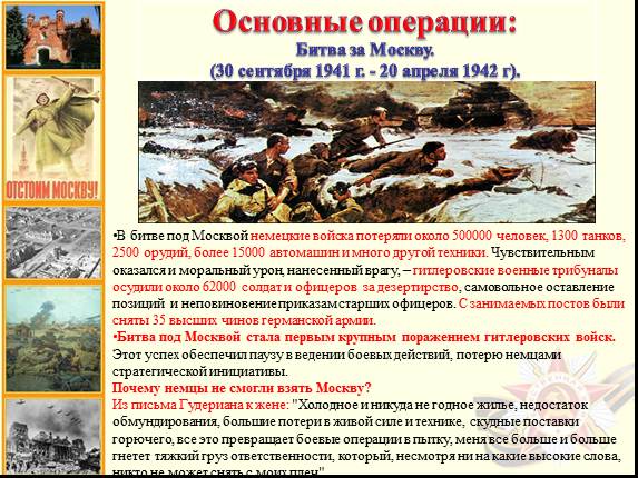 В битве под Москвой немецкие войска потеряли около 500000 человек, 1300 танков, 2500 орудий, более 15000 автомашин и много другой техники. Чувствительным оказался и моральный урон, нанесенный врагу, – гитлеровские военные трибуналы осудили около 62000 солдат и офицеров за дезертирство, самовольное оставление позиций и неповиновение приказам старших офицеров. С занимаемых постов были сняты 35 высших чинов германской армии.