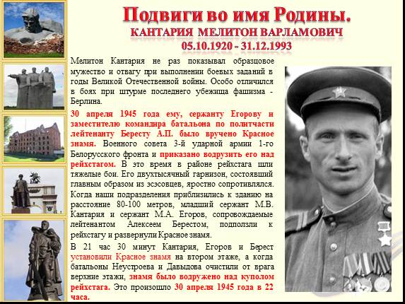 Мелитон Кантария не раз показывал образцовое мужество и отвагу при выполнении боевых заданий в годы Великой Отечественной войны. Особо отличился в боях при штурме последнего убежища фашизма - Берлина.