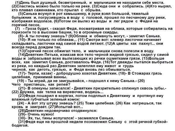 (34)- Хорошо! - похвалил Санька. – (35)Сейчас бы наперегонки с кем! - кинул губку Девяткину: - (36)Ну, и теперь слабо? (37)Подзадоренный Девяткин поднял губку, зачем-то понюхал и осторожно провел ею по груди. (38) - Сильнее надо! (39)Как мочалкой в бане, - Санька, не жалея сил, обеими руками принялся натирать Девяткину грудь, плечи, спину. (40)Прошло несколько минут, и тело Девяткина стало быстро краснеть. (41)Вдруг он вскочил, закрутился на месте, словно его обожгли крапивой, и бросился на Саньку и Федю: (42)- Вы что, сговорились? (43)Те со смехом прыгнули в речку. (44)- Голова! (45)Это же бодяга!(46) Ею люди от простуды лечатся! - кричал из воды Санька. – (47)Крепче лекарств действует. (48)А Петька, ругаясь, катался на берегу, вскакивал, швырял в Саньку и Федю грязью и снова валился на песок. (49) - В воду лезь, в воду! - посоветовал ему с другого берега Федя.(50) - Все пройдет. (51)Девяткин бултыхнулся в речку, и жжение вскоре утихло.(52) Но он еще долго сидел в воде и на чем свет ругал Федю и Саньку, которые не иначе как сговорились против него. (53)К полудню громоздкая, неуклюжая туча, подернутая фиолетовой дымкой, повисла над Стожарами. (54)Резкий порыв ветра пригнул траву к земле, покрыл реку частой рябью, взвихрил сено на верхушке стога. (55)Сверкнула белая молния, с высоты с сухим треском ударил раскат грома, словно где разорвали огромный кусок коленкора, и тяжелые косые струи дождя, как стрелы, пронзили реку. (56)Река закипела, забулькала, на ней заплясали фонтанчики воды.