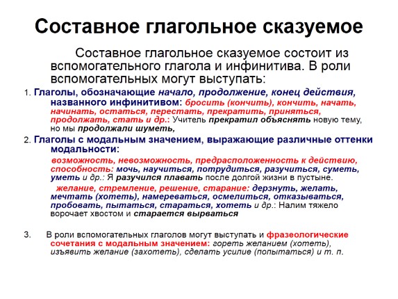 Составное глагольное сказуемое состоит из вспомогательного глагола и инфинитива. В роли вспомогательных могут выступать: