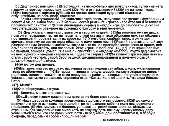 (38)Дед оказался знатным стратегом и строгим судьей. (39)Мы внимали ему не дыша, пока он в перерывах чертил на песке палочкой схемы и тихо объяснял нам, как обходить противников и прорываться к их воротам.(40) У него был слабый голос, и он не мог кричать, поэтому во время игры общался с нами свистком. (41)Резкий, пронзительный звук раздавался над двором в моменты, когда кто-то из нас проводил запрещенный прием, или осмеливался схитрить, или позволить себе играть в полноги. (42)Дед не выкрикивал имен, но каждый, замирая, думал: “Не мне ли свистят?”, и каждому казалось, будто дед смотрит на него одного, и каждый старался не подвести старика. (43)За какие-то три месяца лета мы стали самой честной, самой бесстрашной, дисциплинированной и почему-то самой дружной командой района.