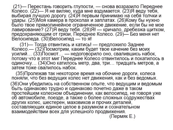 (13)— Как тебе не стыдно? — взвизгнуло на повороте Заднее Колесо.(14) — Это нелепое сравнение по внешнему сходству. (15)Нужно смотреть глубже. (16)Мои спицы напряжены до предела. (17)Я, изнашивая преждевременно мою шину, привожу тебя в движение. (18)И ты бежишь налегке. (19)На холостом ходу. (20)Да еще виляешь, куда тебе вздумается, и при этом называешь себя ведущим колесом.