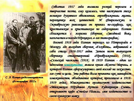События 1917 года вызвали резкий перелом в творчестве поэта, ему казалось, что наступает эпоха великого духовного обновления, «преображения» жизни, переоценки всех ценностей. И Февральскую, и Октябрьскую революции он принял по-скифски, как крестьянские и христианские по содержанию. Есенин сближается с эсерами (сборник «Звездный бык» напечатан в поезде Троцкого, в его типографии).