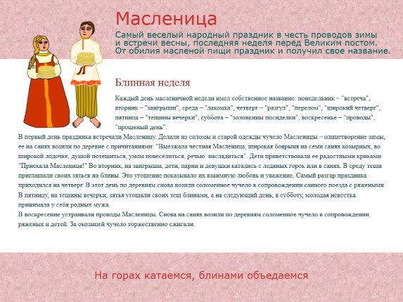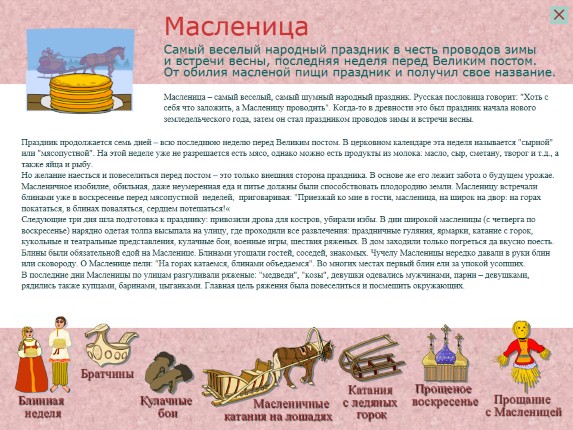 Самый веселый народный праздник в честь проводов зимы и встречи весны, последняя неделя перед Великим постом. От обилия масленой пищи праздник и получил свое название.