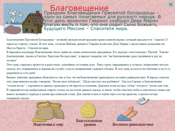 В народе считали, что покровительство Богоматери распространялось на все работы, которые после Благовещения начинались в каждом крестьянском дворе, на полях и огородах. Потому так высоко и чтилась память о Божией Матери в этот день.