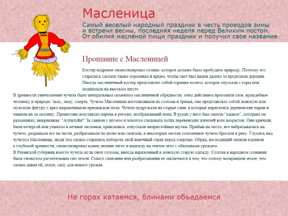 Масленица – самый веселый, самый шумный народный праздник. Русская пословица говорит: "Хоть с себя что заложить, а Масленицу проводить". Когда-то в древности это был праздник начала нового земледельческого года, затем он стал праздником проводов зимы и встречи весны.