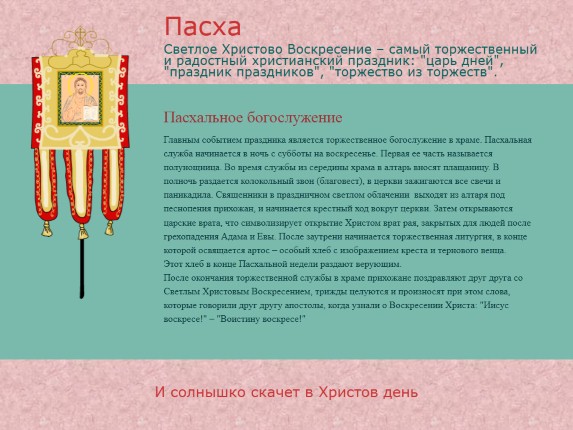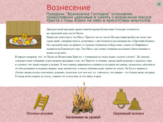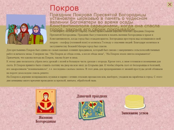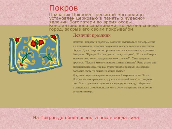 14 октября (1 октября по старому стилю) православная церковь отмечает праздник Покрова Пресвятой Богородицы. Праздник был установлен в память явления Богородицы в храме в Константинополе, когда город был осажден врагом. Богородица простерла над молящимися свой покров – омофор (головной плат) и молилась Господу о спасении людей. Благодаря молитвам и заступничеству Божией Матери город был спасен.