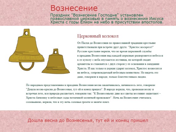 В народном календаре Благовещение было одним из самых почитаемых праздников. Его нередко сопоставляли с Пасхой: "Каково Благовещение, таково и Светлое Христово Воскресение", в народе говорили, что "на Благовещение даже грешников в аду не мучают".