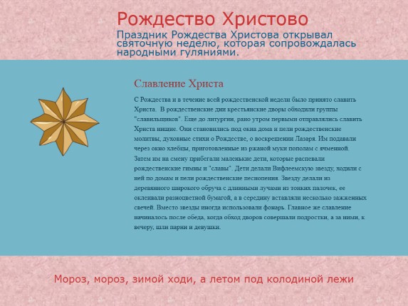 С Рождества и в течение всей рождественской недели было принято славить Христа. В рождественские дни крестьянские дворы обходили группы "славильщиков". Еще до литургии, рано утром первыми отправлялись славить Христа нищие. Они становились под окна дома и пели рождественские молитвы, духовные стихи о Рождестве, о воскрешении Лазаря. Им подавали через окно хлебцы, приготовленные из ржаной муки пополам с ячменной. Затем им на смену прибегали маленькие дети, которые распевали рождественские гимны и "славы". Дети делали Вифлеемскую звезду, ходили с ней по домам и пели рождественские песнопения. Звезду делали из деревянного широкого обруча с длинными лучами из тонких палочек, ее оклеивали разноцветной бумагой, а в середину вставляли несколько зажженных свечей. Вместо звезды иногда использовали фонарь. Главное же славление начиналось после обеда, когда обход дворов совершали подростки, а за ними, к вечеру, шли парни и девушки.