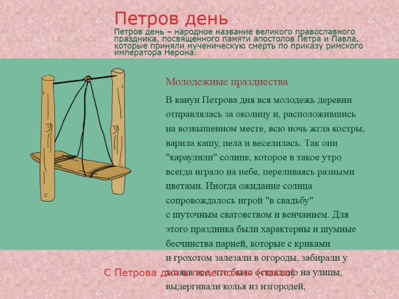 На Петров день был обычай купать молодоженов и обливать друг друга водой. К Петрову дню обязательно строились качели, это были последние весенние качели; до следующей весны их больше не устраивали.