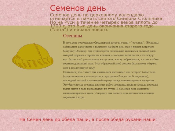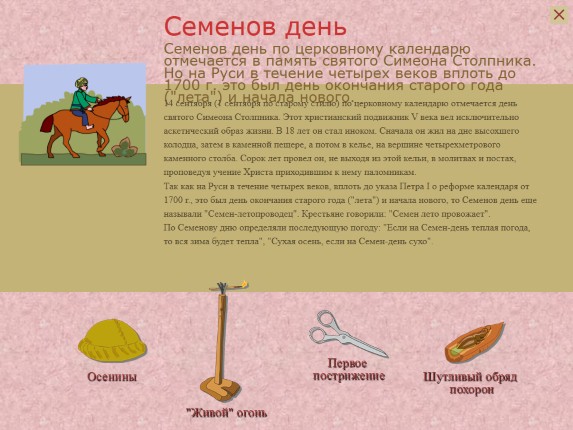 Семенов день по церковному календарю отмечается в память святого Симеона Столпника. Но на Руси в течение четырех веков вплоть до 1700 г. это был день окончания старого года ("лета") и начала нового.