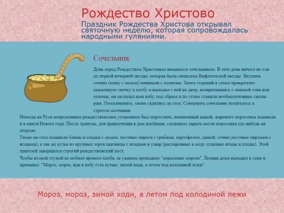 Чтобы весной стужей не побило ярового хлеба, за ужином проходило "кормление мороза". Хозяин дома выходил в сени и призывал: "Мороз, мороз, иди в избу есть кутью; зимой ходи, а летом под колодиной лежи".