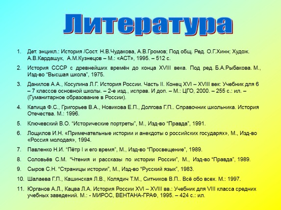 Павленко Н.И. “Пётр I и его время”, М., Изд-во “Просвещение”, 1989.