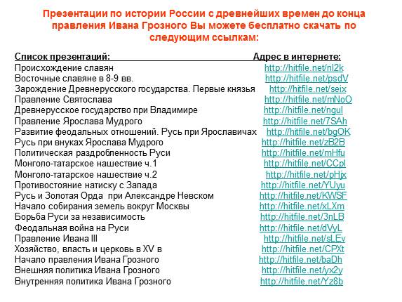 Презентации по истории России с древнейших времен до конца правления Ивана Грозного Вы можете бесплатно скачать по следующим ссылкам: