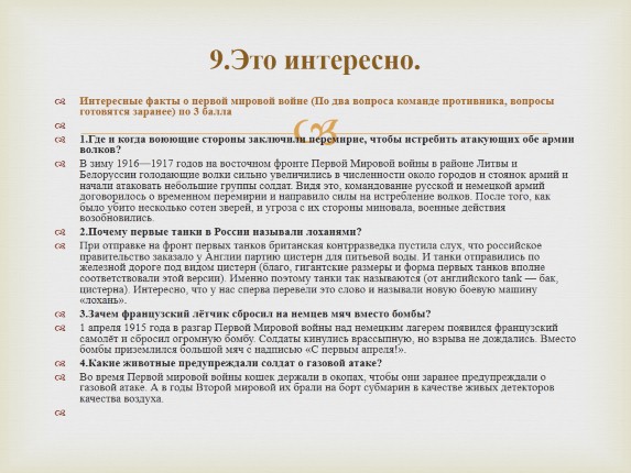 Интересные факты о первой мировой войне (По два вопроса команде противника, вопросы готовятся заранее) по 3 балла
