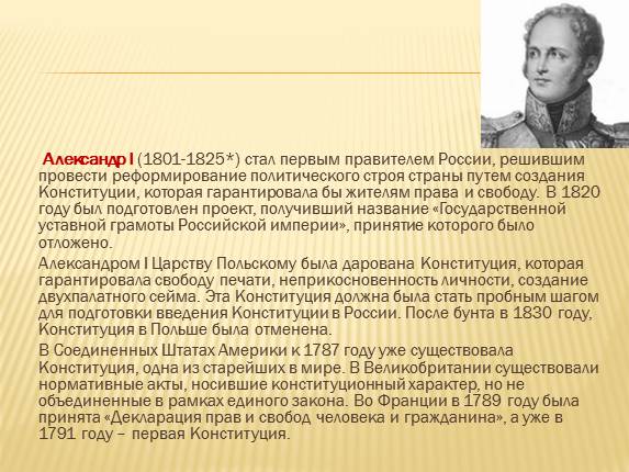 Александр I (1801-1825*) стал первым правителем России, решившим провести реформирование политического строя страны путем создания Конституции, которая гарантировала бы жителям права и свободу. В 1820 году был подготовлен проект, получивший название «Государственной уставной грамоты Российской империи», принятие которого было отложено.
