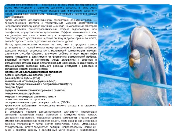 Сегодня дельфинотерапия — признанный во всем мире неспецифический метод иммунотерапии у пациентов различного возраста, а также очень сильная методика психологической реабилитации и коррекции развития у детей, страдающих различными психосоматическими и неврологическими расстройствами.