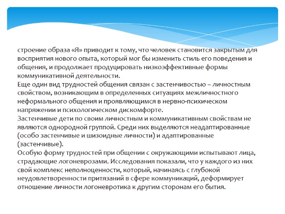 строение образа «Я» приводит к тому, что человек становится закрытым для восприятия нового опыта, который мог бы изменить стиль его поведения и общения, и продолжает продуцировать низкоэффективные формы коммуникативной деятельности.