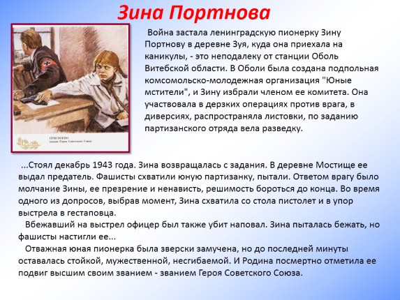 Война застала ленинградскую пионерку Зину Портнову в деревне Зуя, куда она приехала на каникулы, - это неподалеку от станции Оболь Витебской области. В Оболи была создана подпольная комсомольско-молодежная организация "Юные мстители", и Зину избрали членом ее комитета. Она участвовала в дерзких операциях против врага, в диверсиях, распространяла листовки, по заданию партизанского отряда вела разведку.
