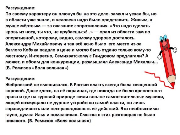 Рассуждение — это тип текста, представляющий размышление, объяснение, доказательство точки зрения говорящего. Для рассуждения характерны следующие компоненты содержания: тезис, аргументация, вывод. Рассуждения содержат вводные слова, передающие связь и последовательность мыслей, такие как: во-первых, во-вторых, с одной стороны, с другой стороны, итак, значит, следовательно и другие подобные. Рассуждение используется для изложения и обоснования точки зрения, особенно при выражении отношения к чему-либо. Представьте себе, что вы столкнулись с проблемой. Обдумывание ситуации, анализ всех за и против, принятие решения и будут выражены в форме рассуждения.