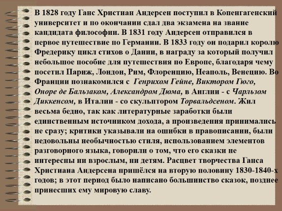 В 1828 году Ганс Христиан Андерсен поступил в Копенгагенский университет и по окончании сдал два экзамена на звание кандидата философии. В 1831 году Андерсен отправился в первое путешествие по Германии. В 1833 году он подарил королю Фредерику цикл стихов о Дании, в награду за который получил небольшое пособие для путешествия по Европе, благодаря чему посетил Париж, Лондон, Рим, Флоренцию, Неаполь, Венецию. Во Франции познакомился с Генрихом Гейне, Виктором Гюго, Оноре де Бальзаком, Александром Дюма, в Англии - с Чарльзом Диккенсом, в Италии - со скульптором Торвальдсеном. Жил весьма бедно, так как литературные заработки были единственным источником дохода, а произведения принимались не сразу; критики указывали на ошибки в правописании, были недовольны необычностью стиля, использованием элементов разговорного языка, говорили о том, что его сказки не интересны ни взрослым, ни детям. Расцвет творчества Ганса Христиана Андерсена пришёлся на вторую половину 1830-1840-х годов; в этот период было написано большинство сказок, позднее принесших ему мировую славу.