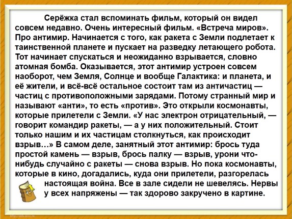 Серёжка стал вспоминать фильм, который он видел совсем недавно. Очень интересный фильм. «Встреча миров». Про антимир. Начинается с того, как ракета с Земли подлетает к таинственной планете и пускает на разведку летающего робота. Тот начинает спускаться и неожиданно взрывается, словно атомная бомба. Оказывается, этот антимир устроен совсем наоборот, чем Земля, Солнце и вообще Галактика: и планета, и её жители, и всё-всё остальное состоит там из античастиц — частиц с противоположными зарядами. Потому странный мир и называют «анти», то есть «против». Это открыли космонавты, которые прилетели с Земли. «У нас электрон отрицательный, — говорит командир ракеты, — а у них положительный. Стоит только нашим и их частицам столкнуться, как происходит взрыв…» В самом деле, занятный этот антимир: брось туда простой камень — взрыв, брось палку — взрыв, урони что-нибудь случайно с ракеты — снова взрыв. Но пока космонавты, которые в кино, догадались, куда они прилетели, разгорелась настоящая война. Все в зале сидели не шевелясь. Нервы у всех напряжены — так здорово закручено в картине.