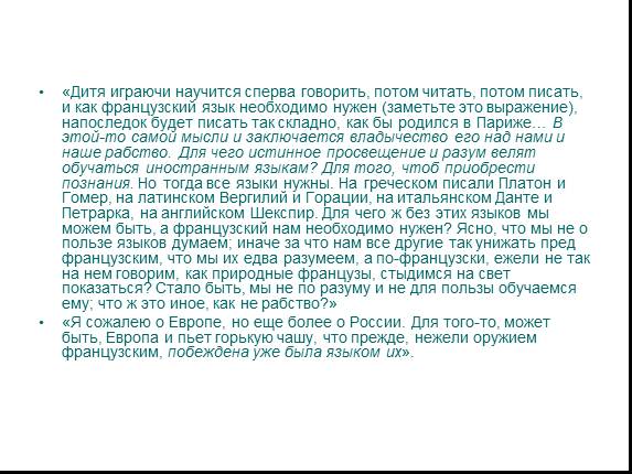 «Дитя играючи научится сперва говорить, потом читать, потом писать, и как французский язык необходимо нужен (заметьте это выражение), напоследок будет писать так складно, как бы родился в Париже… В этой-то самой мысли и заключается владычество его над нами и наше рабство. Для чего истинное просвещение и разум велят обучаться иностранным языкам? Для того, чтоб приобрести познания. Но тогда все языки нужны. На греческом писали Платон и Гомер, на латинском Вергилий и Горации, на итальянском Данте и Петрарка, на английском Шекспир. Для чего ж без этих языков мы можем быть, а французский нам необходимо нужен? Ясно, что мы не о пользе языков думаем; иначе за что нам все другие так унижать пред французским, что мы их едва разумеем, а по-французски, ежели не так на нем говорим, как природные французы, стыдимся на свет показаться? Стало быть, мы не по разуму и не для пользы обучаемся ему; что ж это иное, как не рабство?»