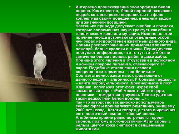 Интересно происхождение зооморфизма белая ворона. Как известно, белой вороной называют людей, которые резко выделяются на фоне коллектива своим поведением, внешним видом или жизненной позицией. Частенько природа допускает ошибки и промахи, которые современная наука трактует как сбои в генетическом коде или мутации. Именно по этой причине иногда встречаются отдельные особи, чей окрас несвойственен животным данного вида. Самым распространенным примером являются, пожалуй, белые кролики и мыши. Периодически поступает информация, что то тут, то там были замечены белые лисицы, рыбы и даже жабы. Причина этого явления в отсутствии в волосяном и кожном покрове пигмента, отвечающего за окрас. Подобные отклонения назвали специальным термином – альбинизмом. Соответственно, животные, страдающие от данного недуга – альбиносы. И большая редкость – найти ворону-альбиноса. Древнеримский поэт Ювенал, используя этот факт, изрек свой знаменитый перл: «Раб может выйти в цари, пленники – дождаться триумфа. Только удачник такой редкостной белой вороны…» . Так что авторство так широко используемой сейчас фразы принадлежит римлянину, жившему 2000 лет назад. Кстати говоря, у этого выражения есть восточный аналог – «белый слон». Альбинизм крайне редко встречается среди слонов, поэтому в юго-восточной Азии слоны с белым цветом кожи считаются священными животными
